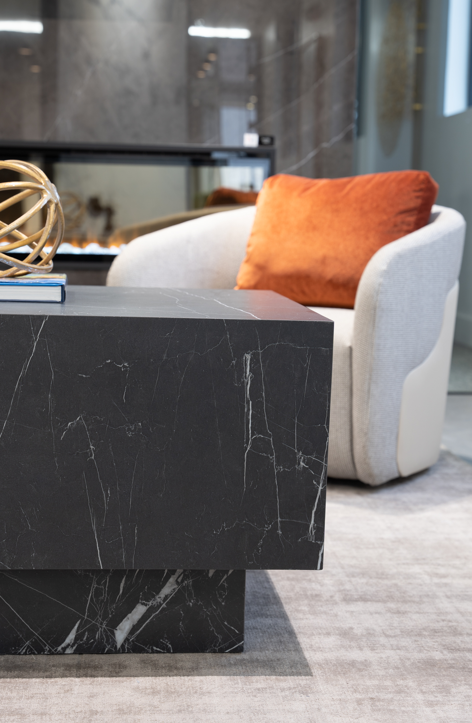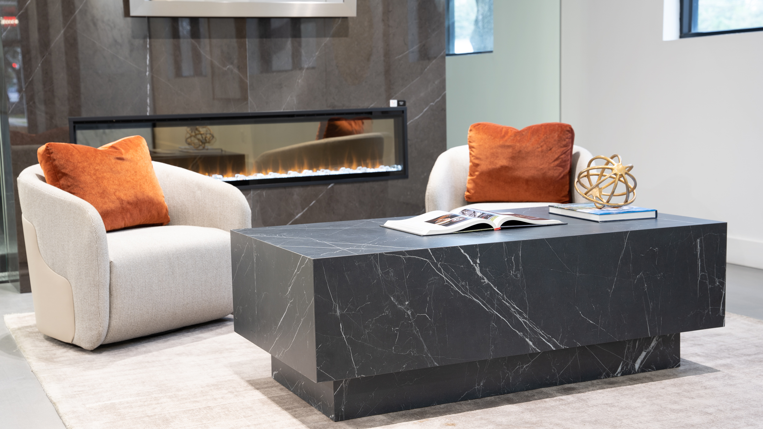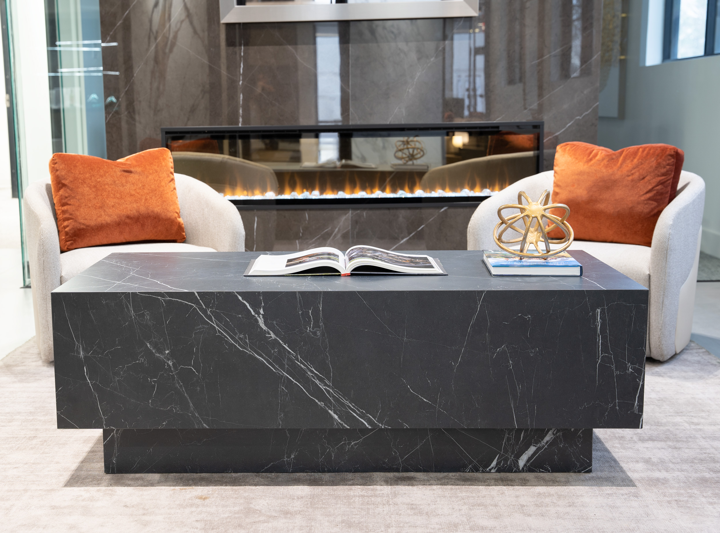 Moderno crafts large-format porcelain tables from four marble-like colors and two finishes, a sleek, high-gloss polish, and a more subtle, softer feel of a matte texture.