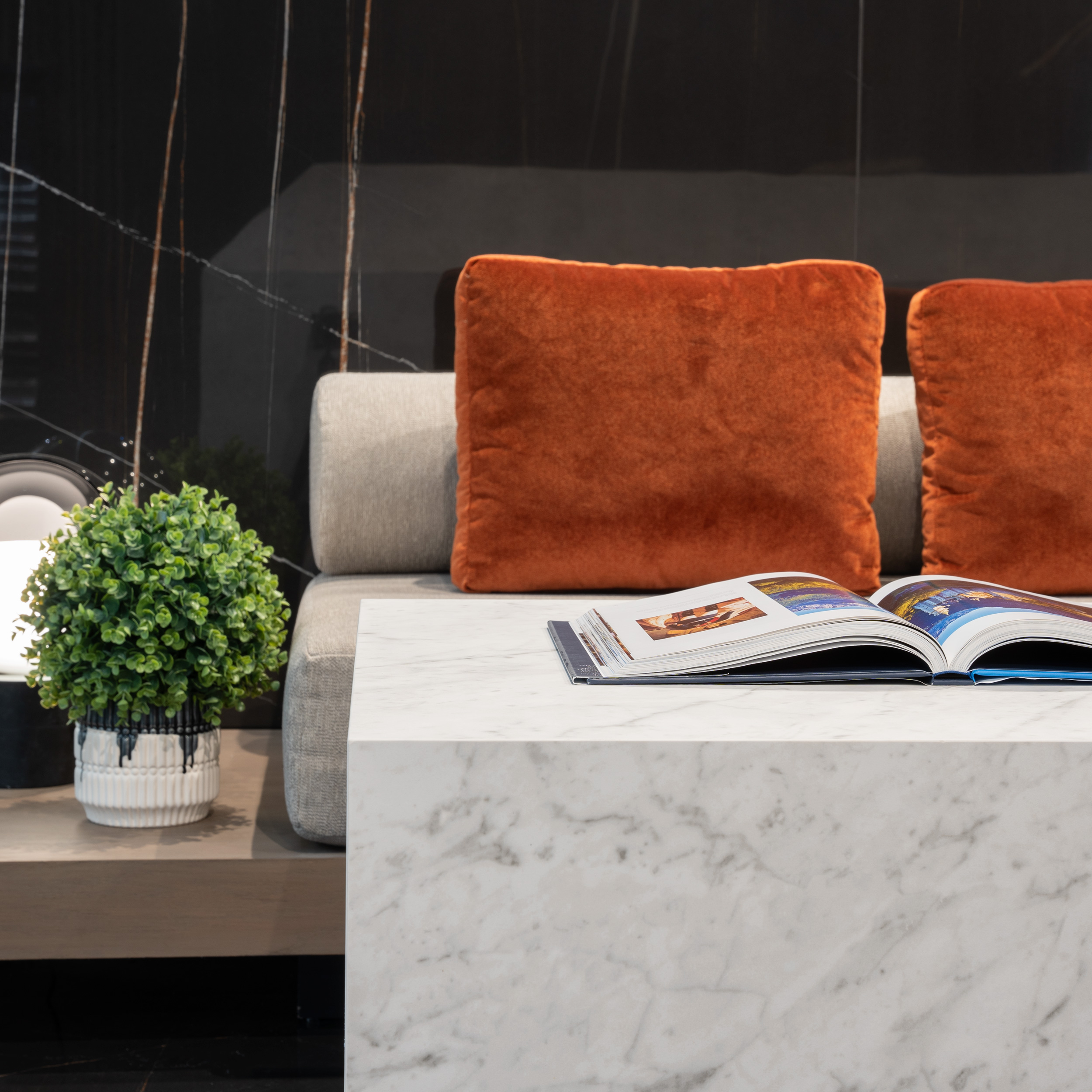 Moderno crafts large-format porcelain tables from four marble-like colors and two finishes, a sleek, high-gloss polish, or a more subtle, softer feel of a matte texture.