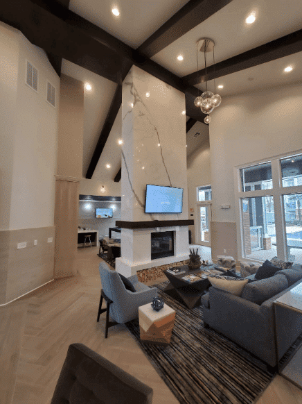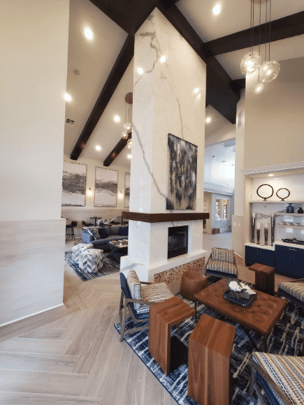 As part of a newly renovated clubhouse at the luxurious Avana Sugarland Apartments, Moderno installed a soaring two-story double-sided fireplace surrounded by custom Extra Vena porcelain. The floor-to-ceiling porcelain was vein-matched from top to bottom and wrapped around the edges. The installation required expert handling due to the height of the ceiling. The feature wall in the bar area was also vein-matched end-to-end to provide a seamless appearance.