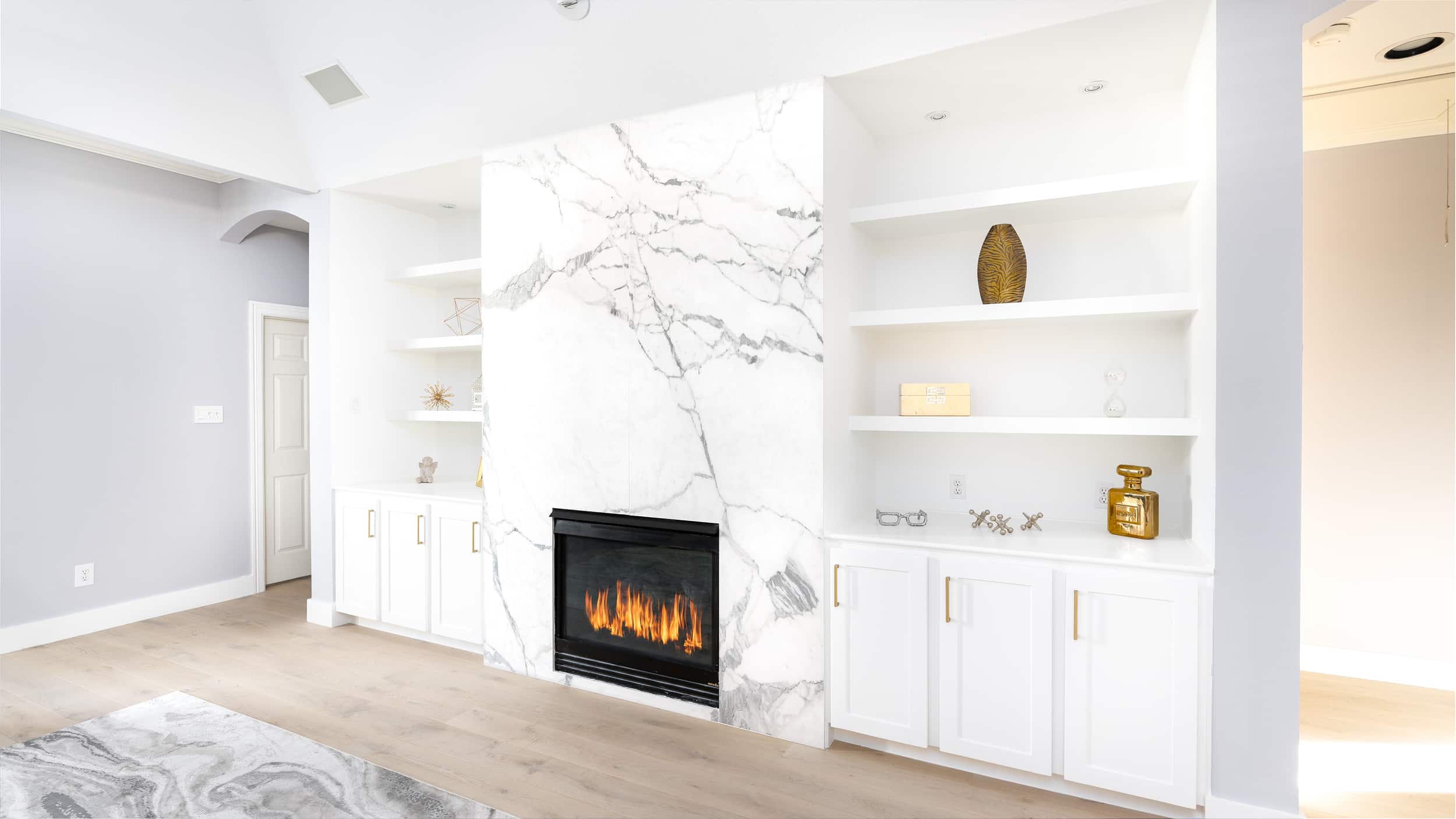 The wall-cladding fireplace, using Bianco Statuario porcelain from StonePeak, was installed with the expertise of Moderno’s fabrication and installation team. Large-format porcelain slabs hold useful qualities such as being thermal- and shock-resistant. They can also be installed onto any wall application while covering large surface areas with minimal grout lines. The high-gloss aspect of the porcelain exhibits a modern look and completes the look of luxury in this Houston residence.