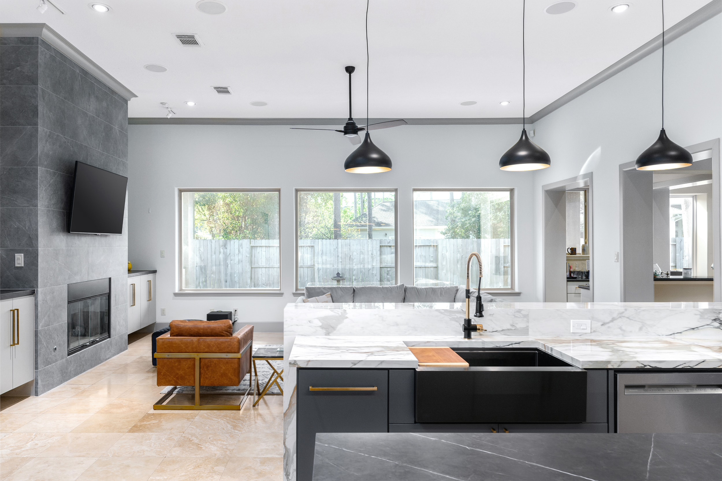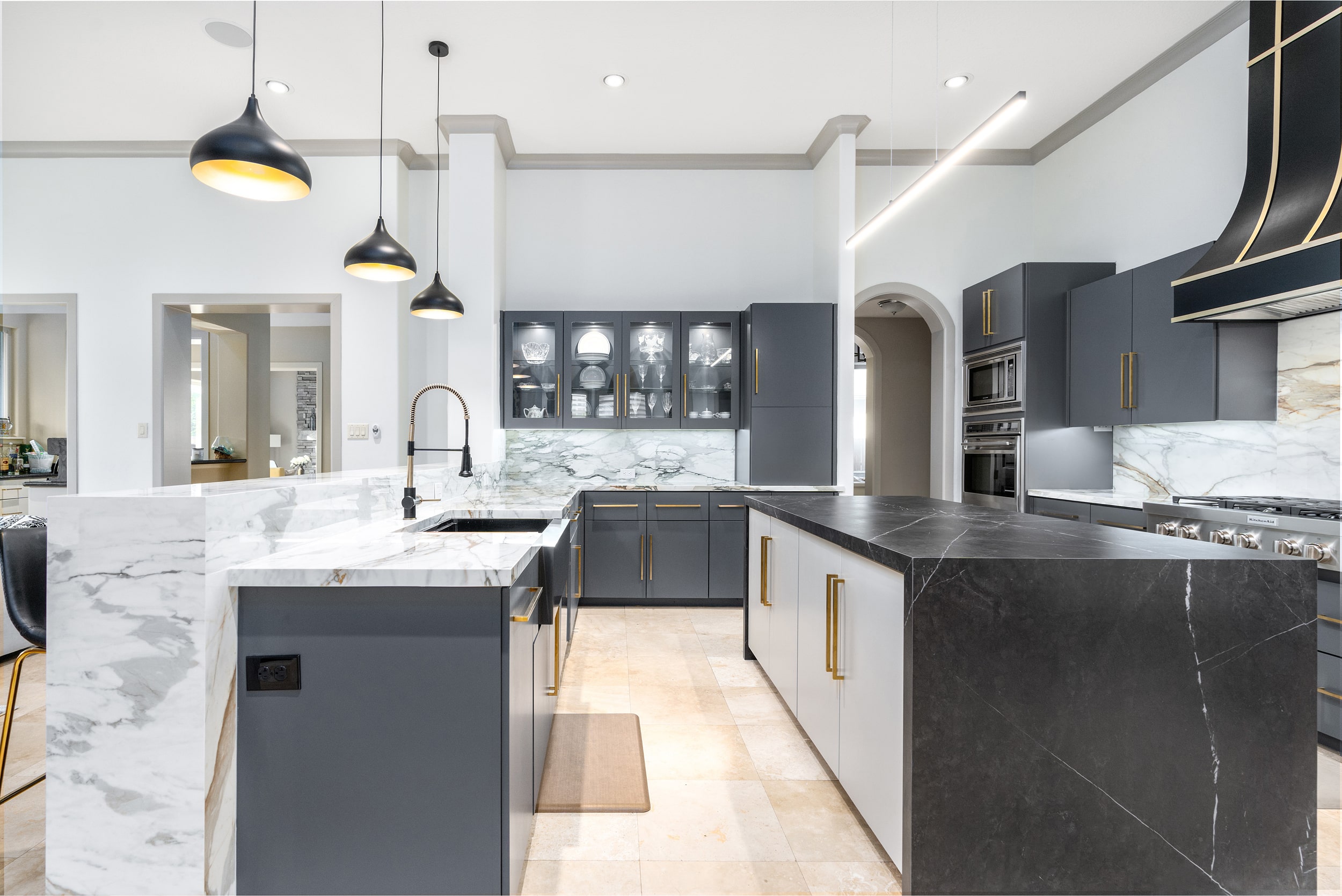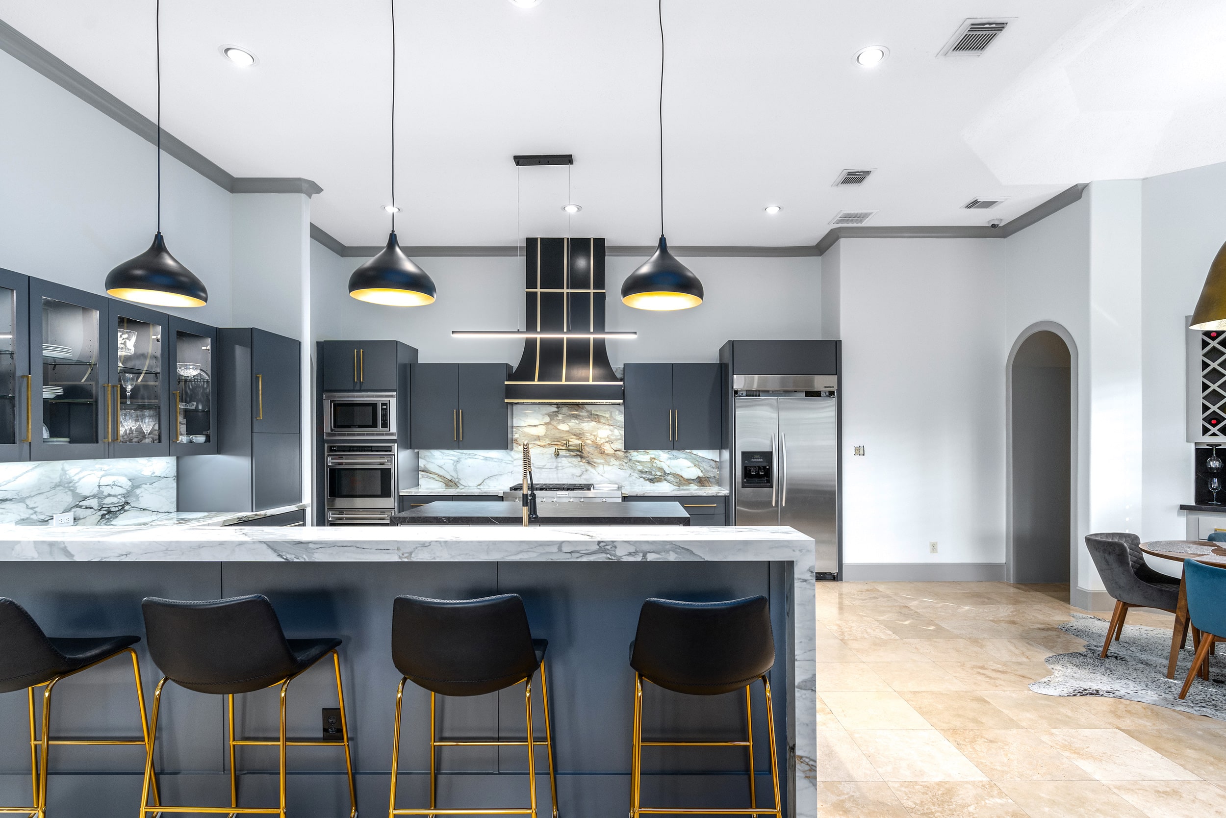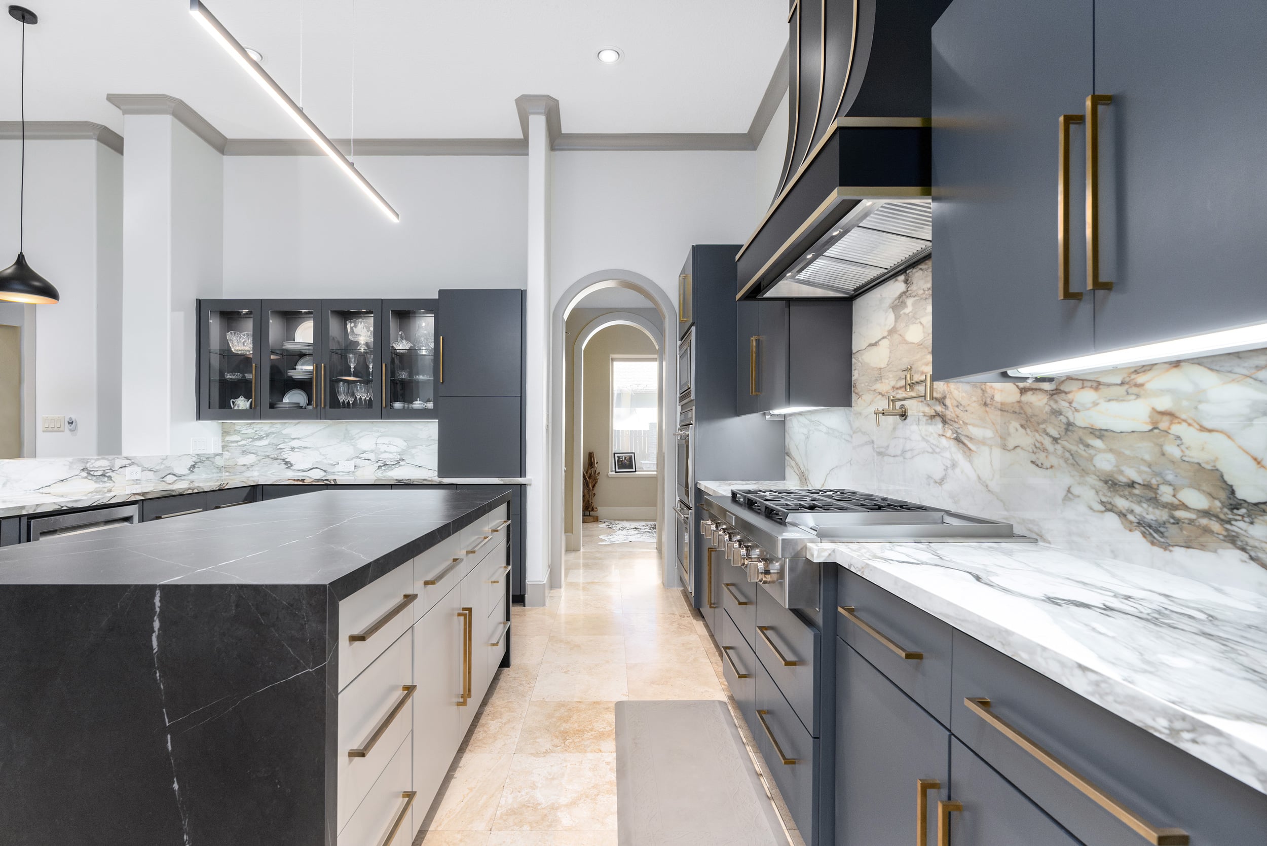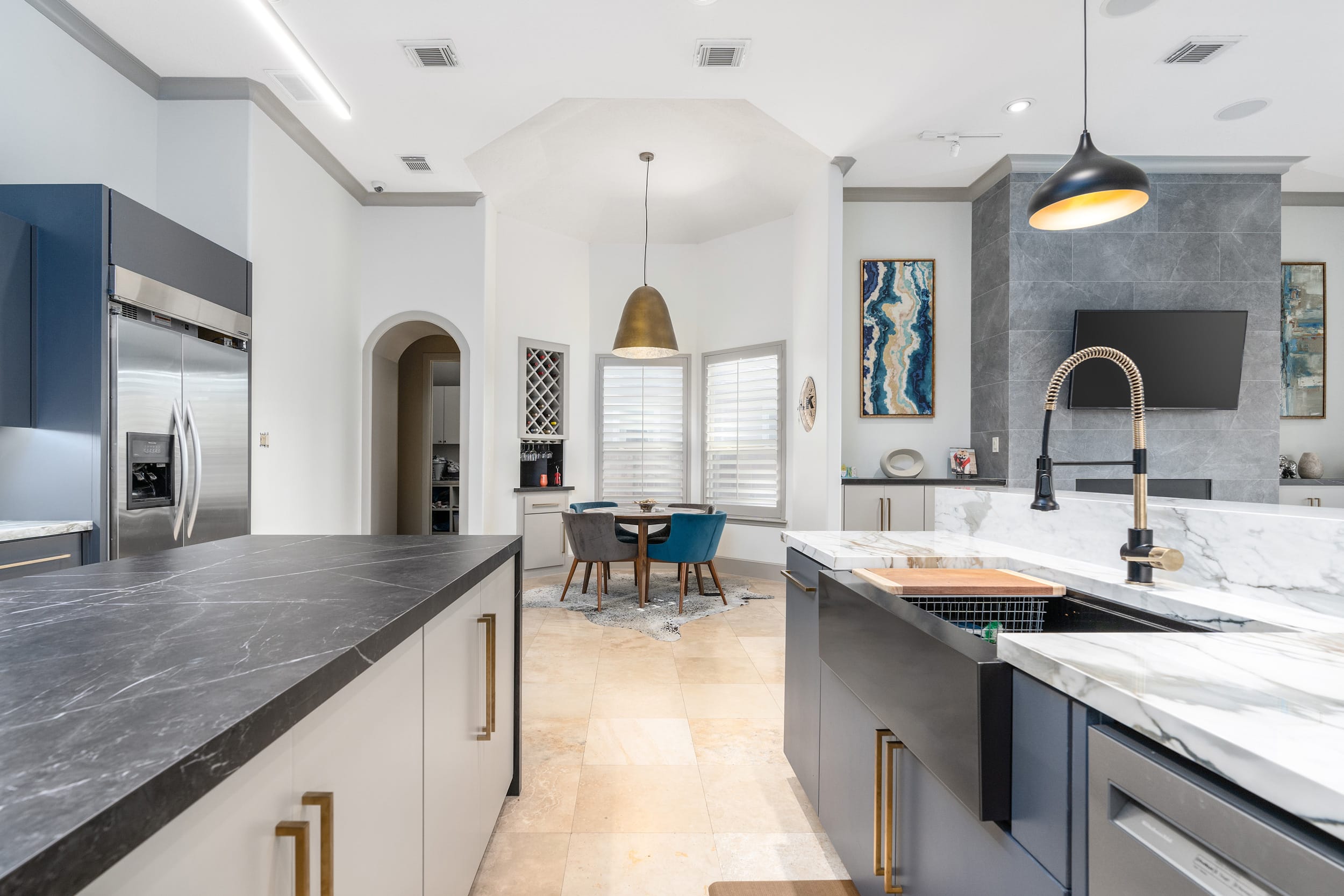 This stunning remodeled residential kitchen shins with two different porcelain colors: Pietra Gray and Daltile’s Calacatta Topaz. The homeowner chose polished Calacatta Topaz for the vein-matched kitchen countertop and backsplash as it carries a warm undertone and ties in with the dark Pietra Gray island. Porcelain is the perfect countertop material for its scratch- and stain-resistant benefits, exhibiting an elegant and modern style across the kitchen. These two colors are elegantly paired and heighten the sophistication of this Houston home with the installation of porcelain.