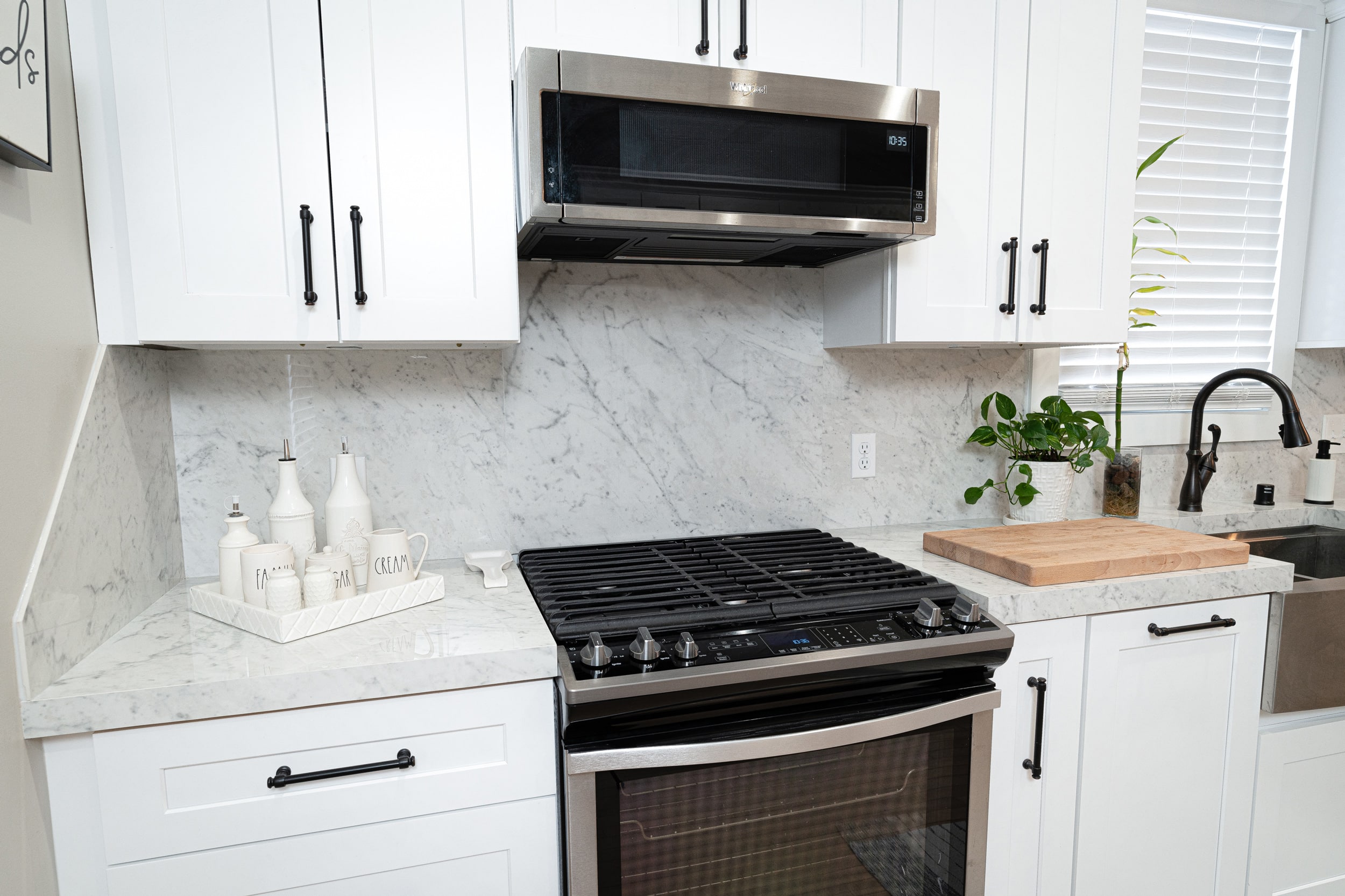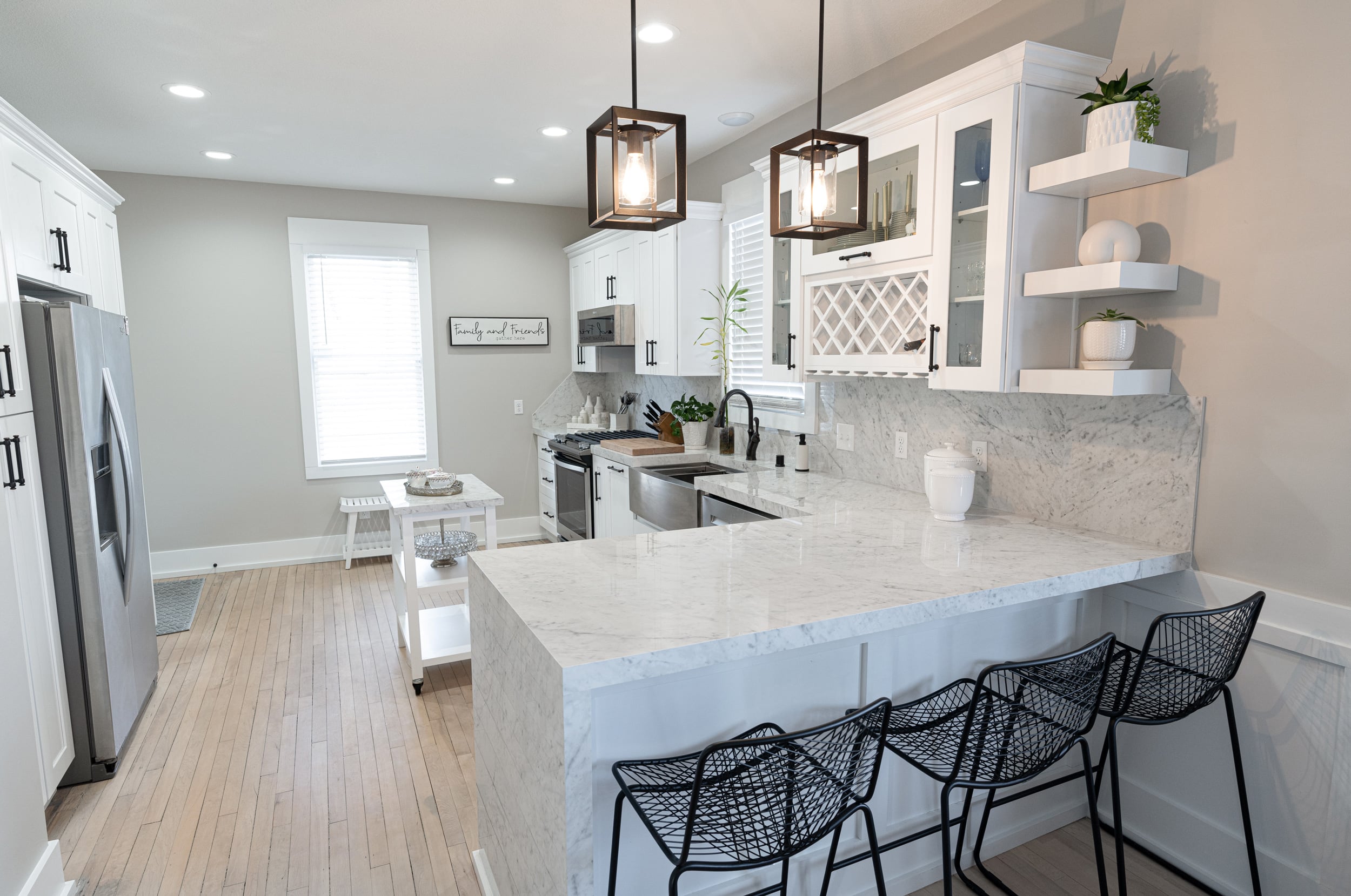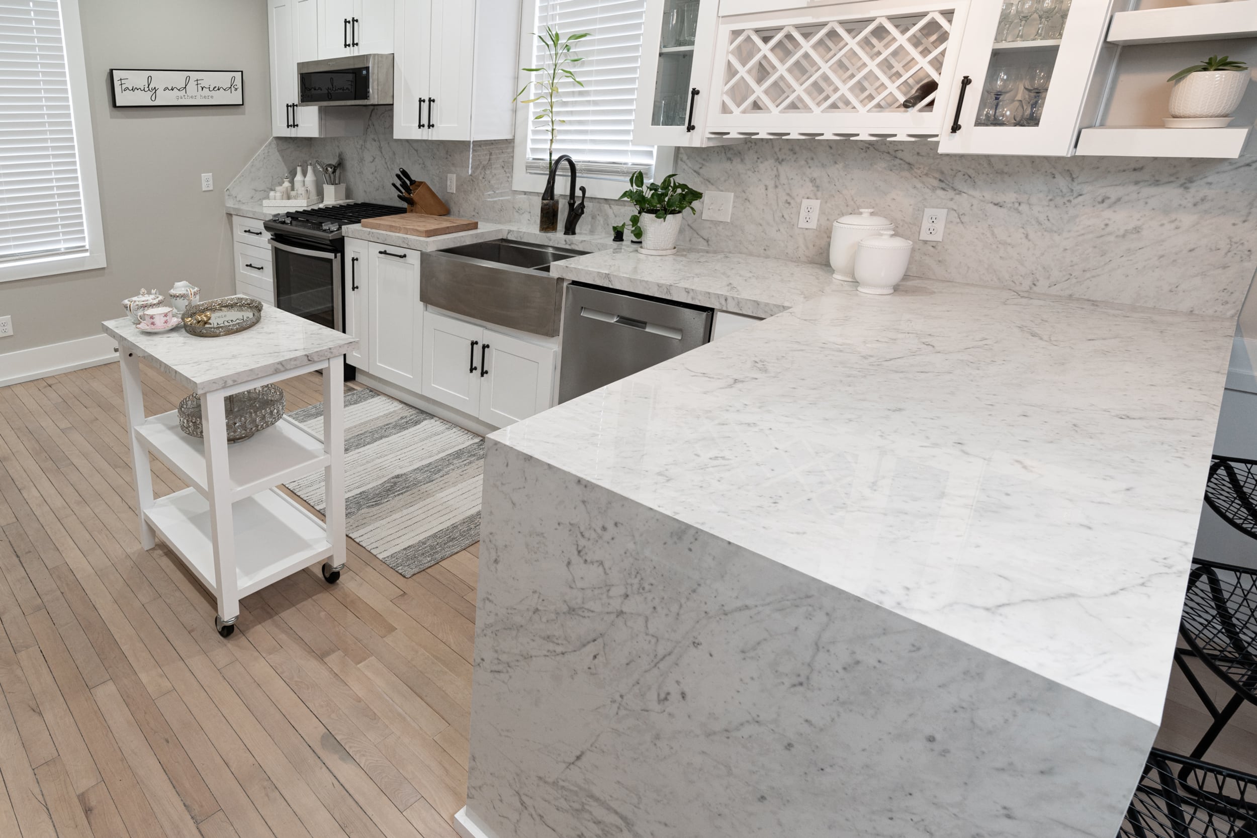 Featured in this residential kitchen is Bianco Carrara with a specialty high-gloss finish. This kitchen countertop and backsplash with Moderno’s scratch-resistant porcelain achieve a luxurious look in this Minnesota home. Having porcelain installed continuously from the backsplash to the floor with a waterfall edge, shows off the benefit of porcelain’s classy timelessness. Additionally, the same color porcelain has been installed onto the bar cart tying the kitchen together. The installation of any large format porcelain can be accomplished on any surface with the precise handling and placement by the Moderno installation team.