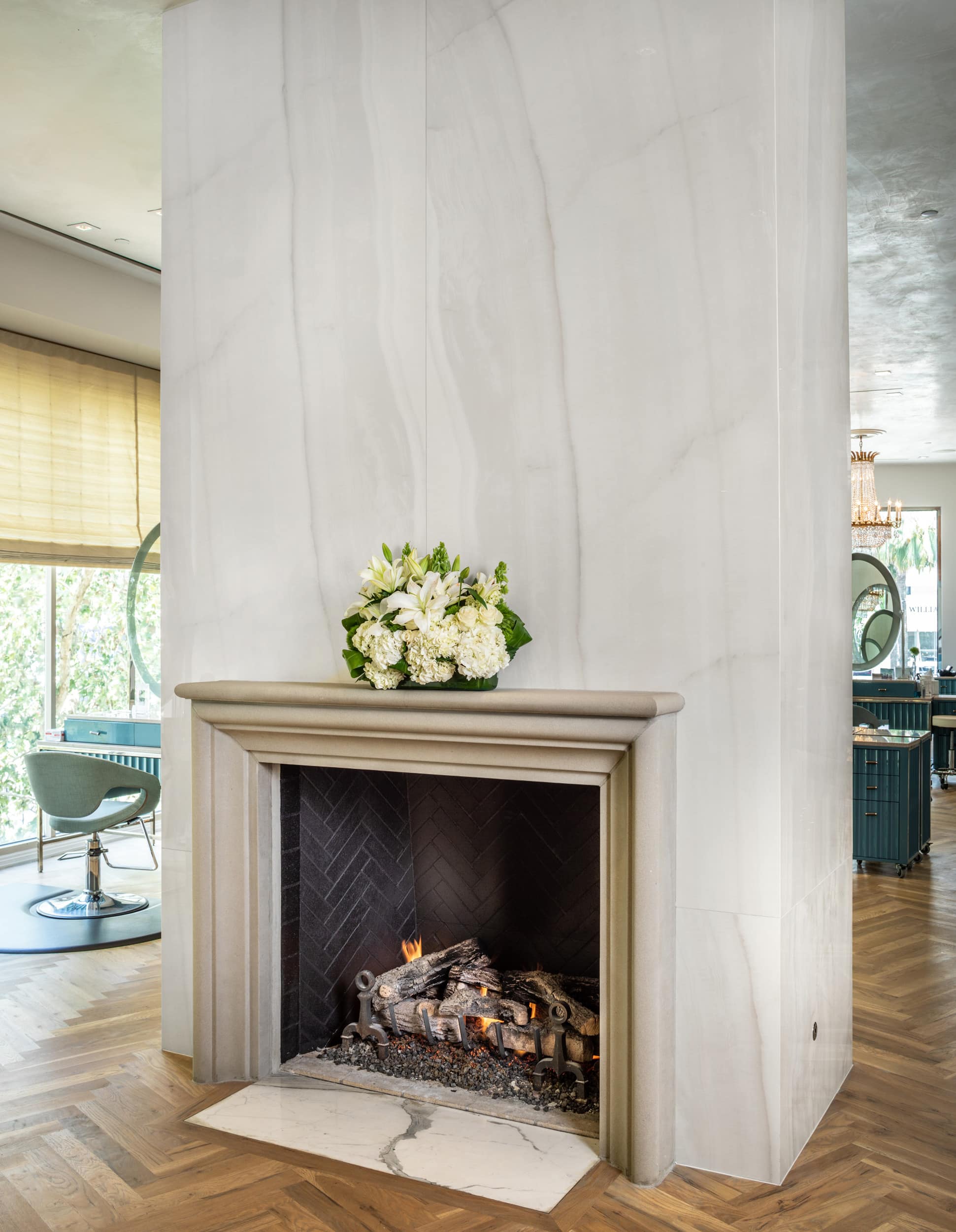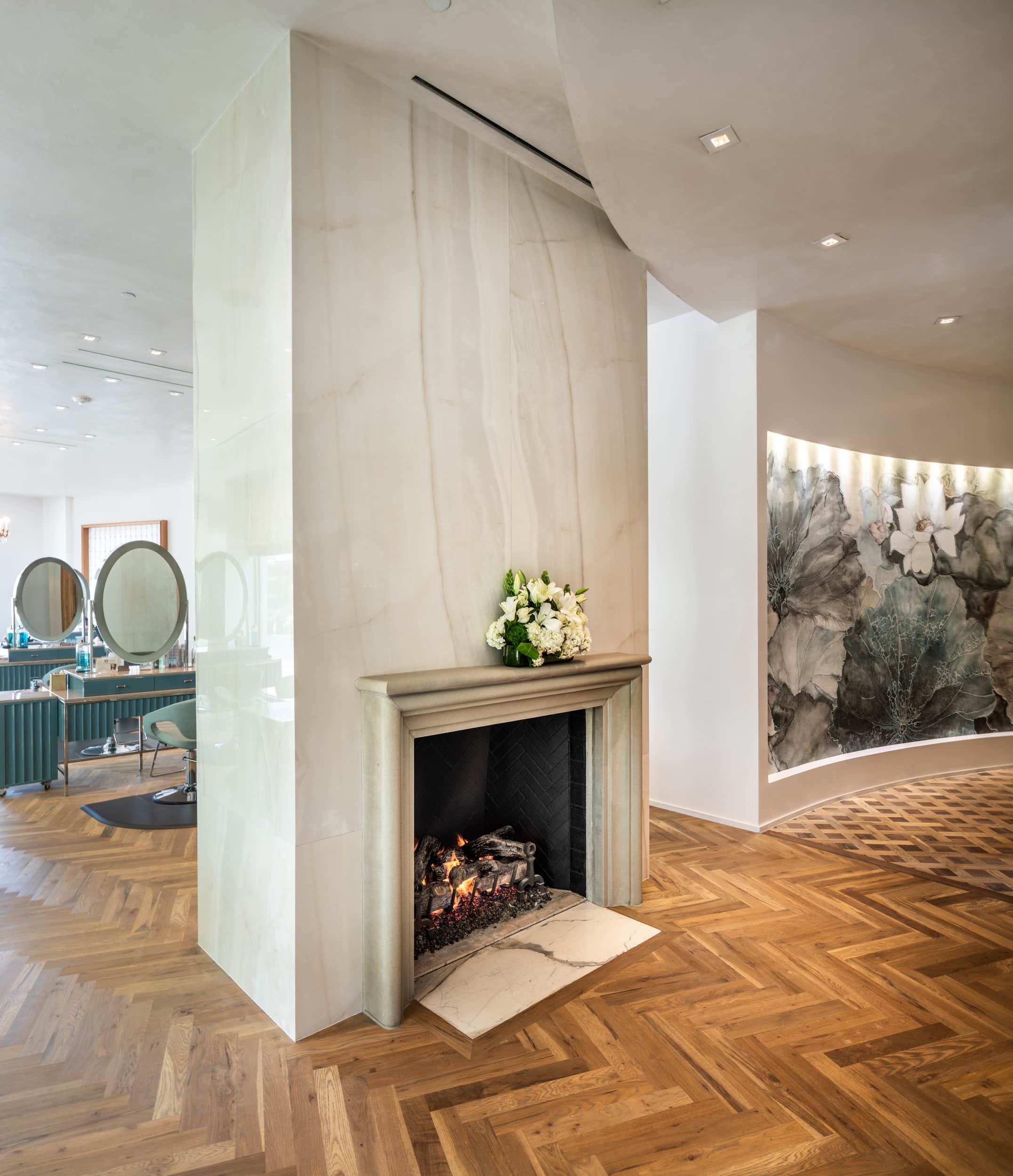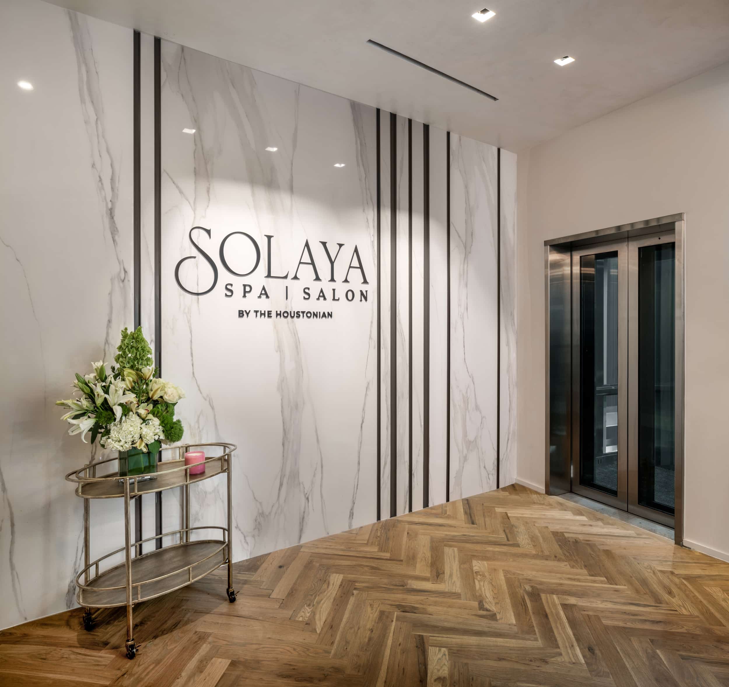 As part of a full renovation of the space to accommodate the new luxury spa and salon by the award-winning The Houstonian Hotel and Club, Moderno installed stunning floor-to-ceiling Calacatta Gold accent walls in the reception area, as well as dramatic wall cladding for a parlor area, the massage rooms, and reception desk counter surfacing. The free-standing floor-to-ceiling fireplace was vein matched and wrapped on all four sides. The second-story location did not allow for the large slabs to be moved with the elevator. Each of the seven, 10-foot slabs were hand-carried upstairs and installed without any breakage.