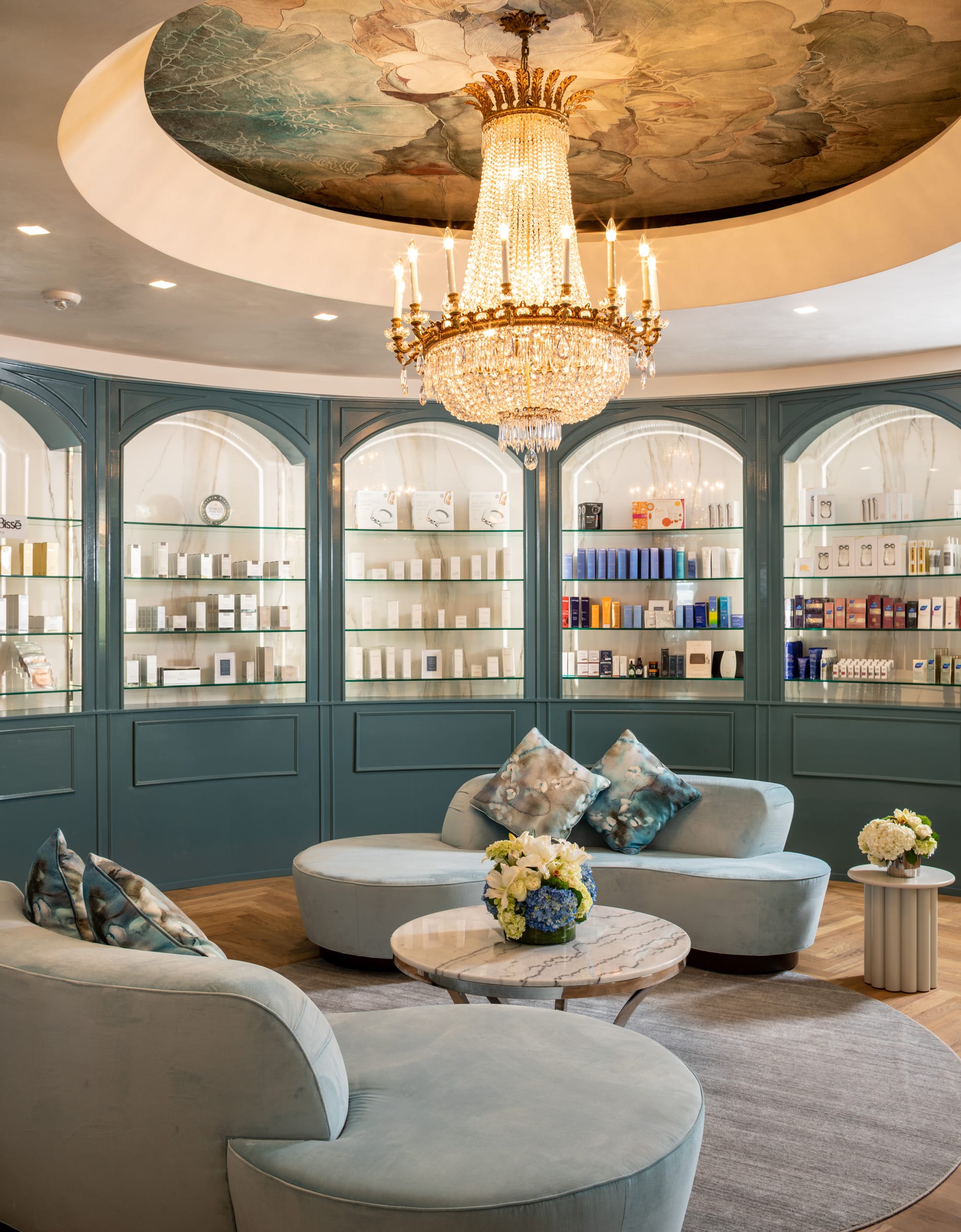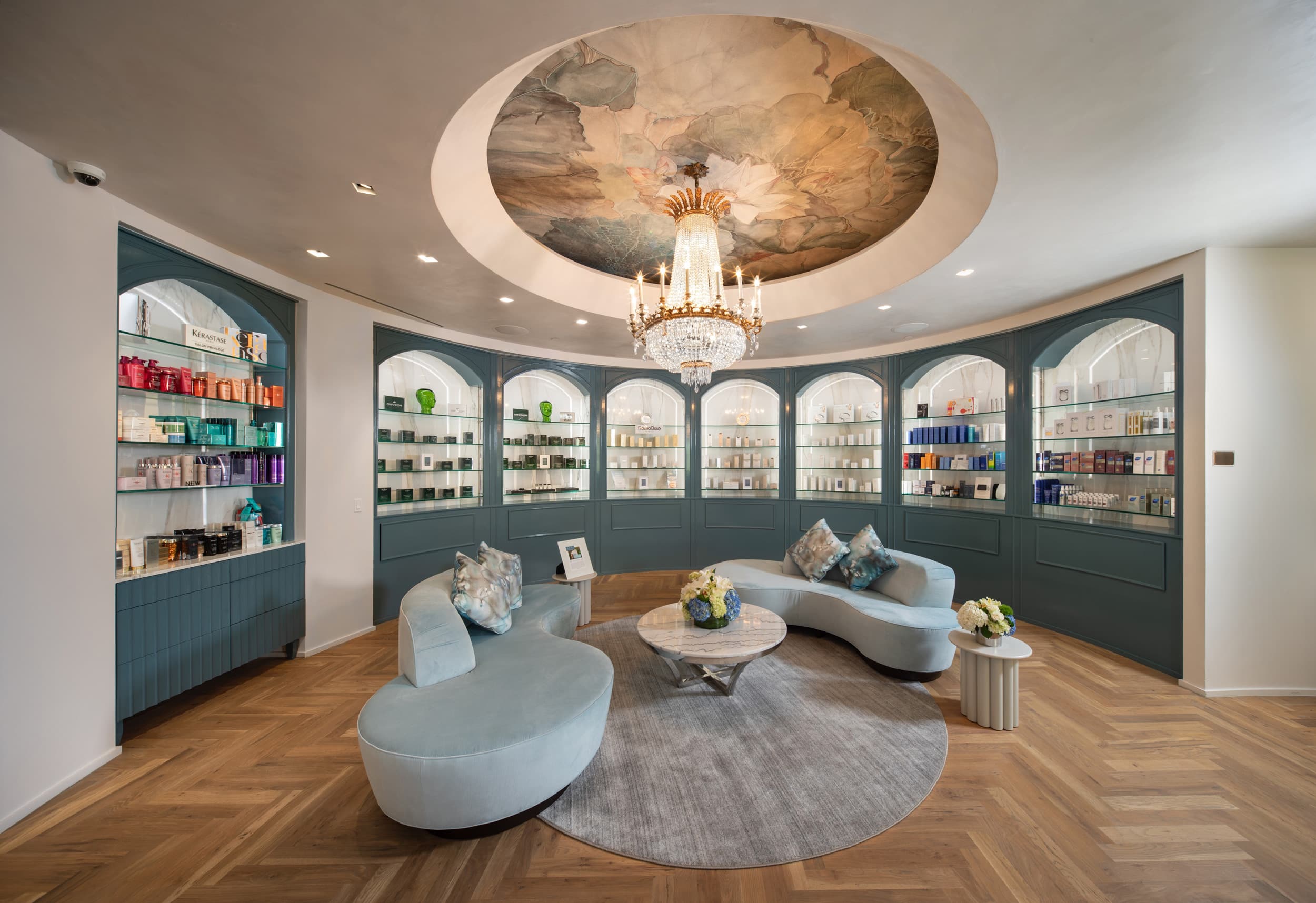 Display walls, accent walls, reception desk countertop, massage room countertops, & fireplace surround
